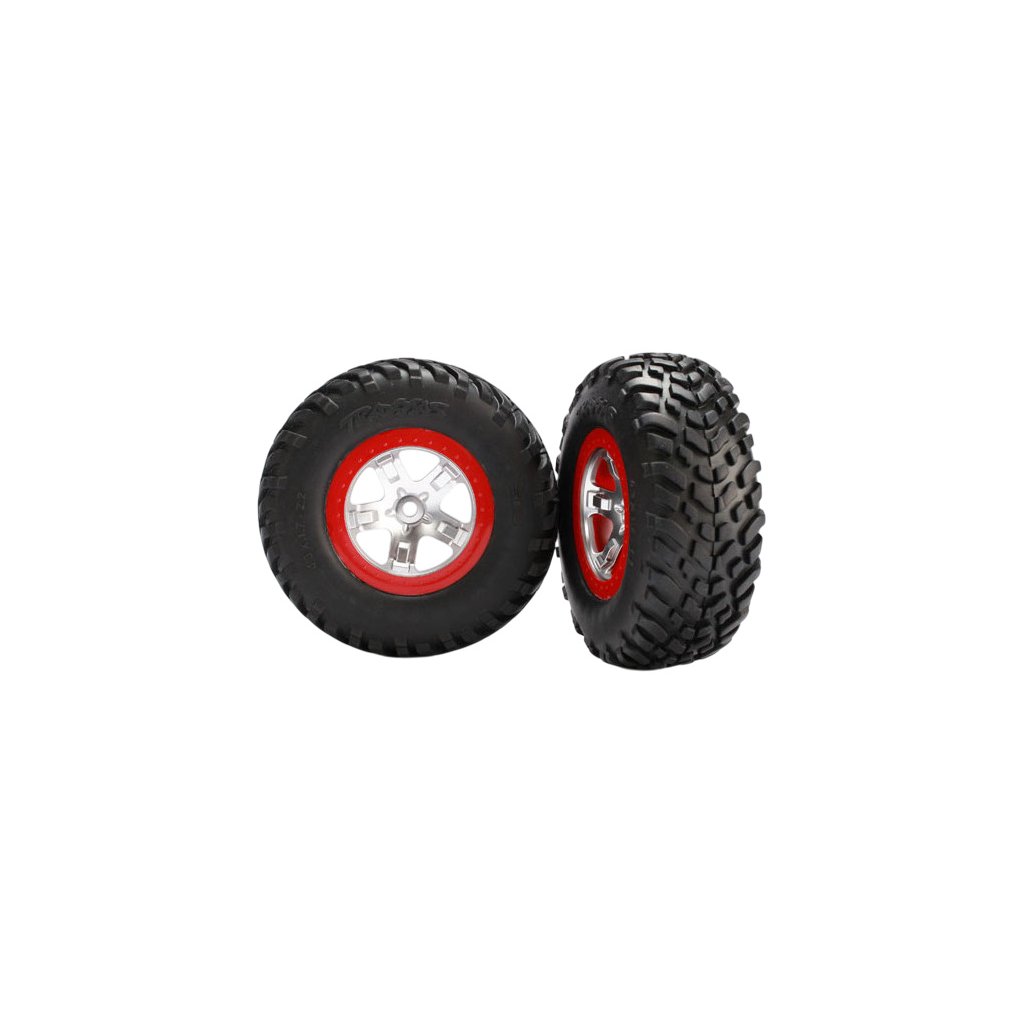 Kompletní zadní kola pro 2WD, přední i zadní pro 4WD auta Traxxas Slash. Chromované disky s červenými ráfky a nalepenými pneumatikami z ultra měkké směsi s vložkou.