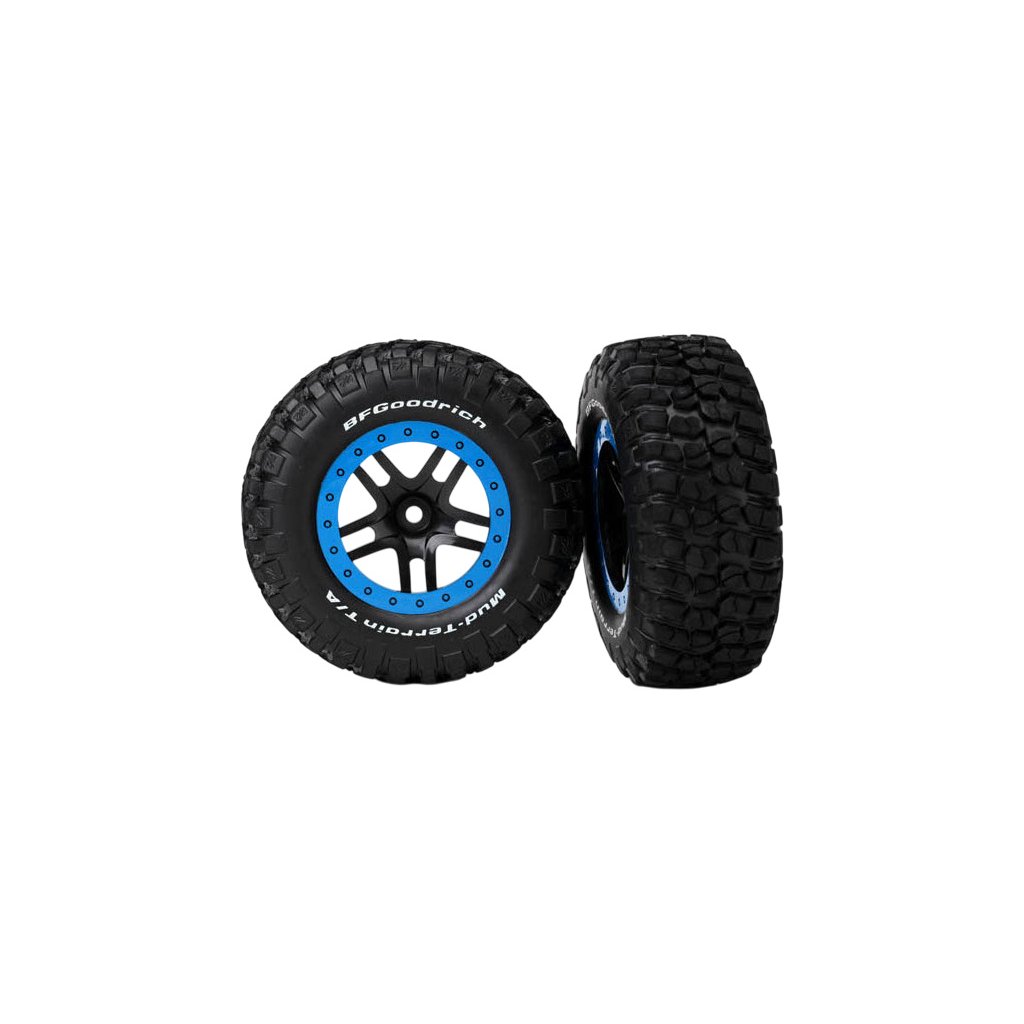 Kompletní zadní kola pro 2WD, přední i zadní kola pro 4WD RC auta Traxxas Slash. Disky Split Spoke černé se modrými ráfky, nalepené pneumatiky Goodrich KM2 Mud Terrain.