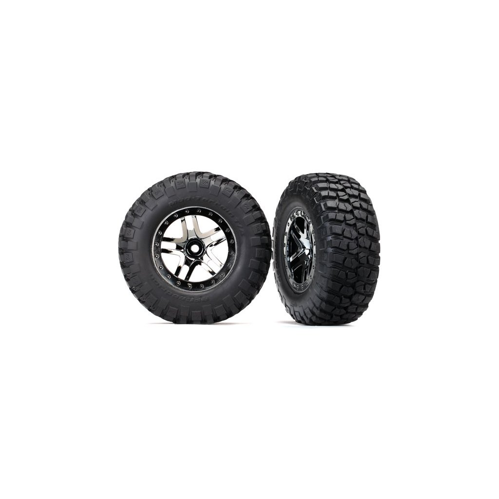 Kompletní zadní kola pro 2WD, přední i zadní pro 4WD RC auta Traxxas. Stříbrný disk Split-Spoke s pneumatikami BFGoodrich KM2 Mud Terrain (S1 super měkká směs) s vložkou.