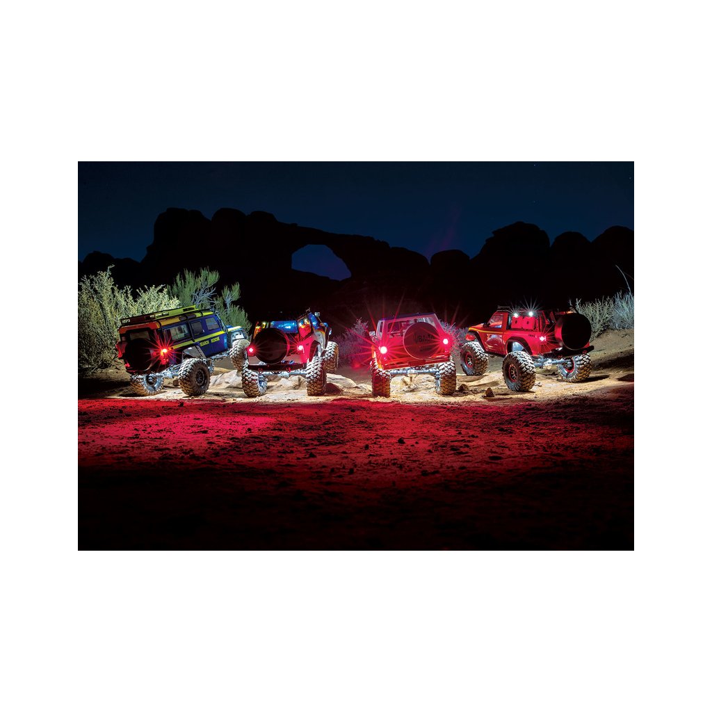 S touto sadou dovedete Váš expediční model k dokonalosti. U modelů TRX s RC soupravou TQi lze navíc osvětlení ovládat dálkově. Stačí doplnit Bluetooth modul (prodává se samostatně) do vysílače a nainstalovat bezplatnou aplikaci Traxxas Link. Ve vašem telefonu v přehledné grafické aplikaci, tak můžete ovládat jednotlivá světla na dálku, měnit režim, aktivovat výstražná světla apod. Sadu osvětlení je možné instalovat i na modely TRX s RC souprava TQ, zde se osvětlení ovládá přímo tlačítky na řídícím modulu.