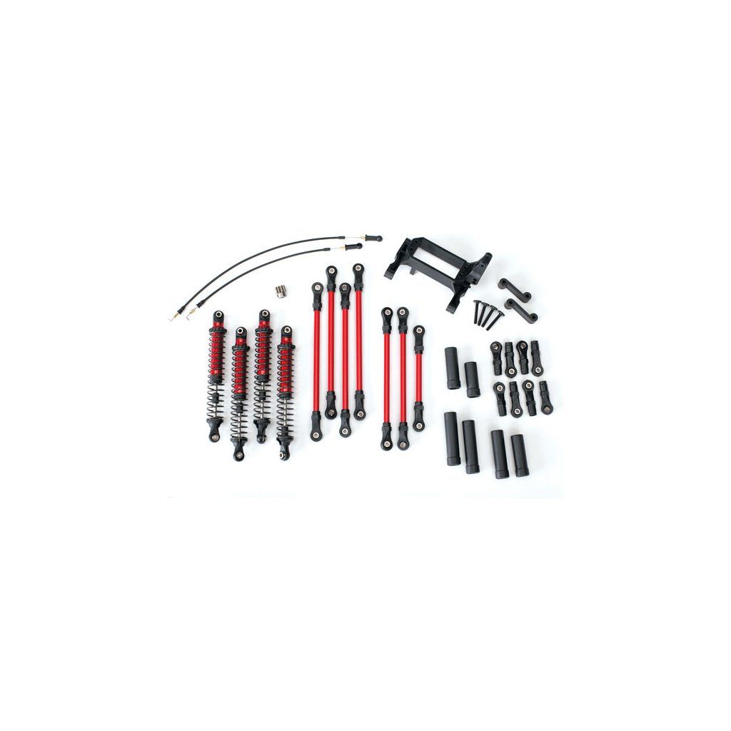 Tuningová konverzní sada v červené barvě pro podvozek Traxxas TRX-4 umožňující vyšší zdvih kol. Sada obsahuje veškeré potřebné díly potřebné k přestavbě. Sada obsahuje: