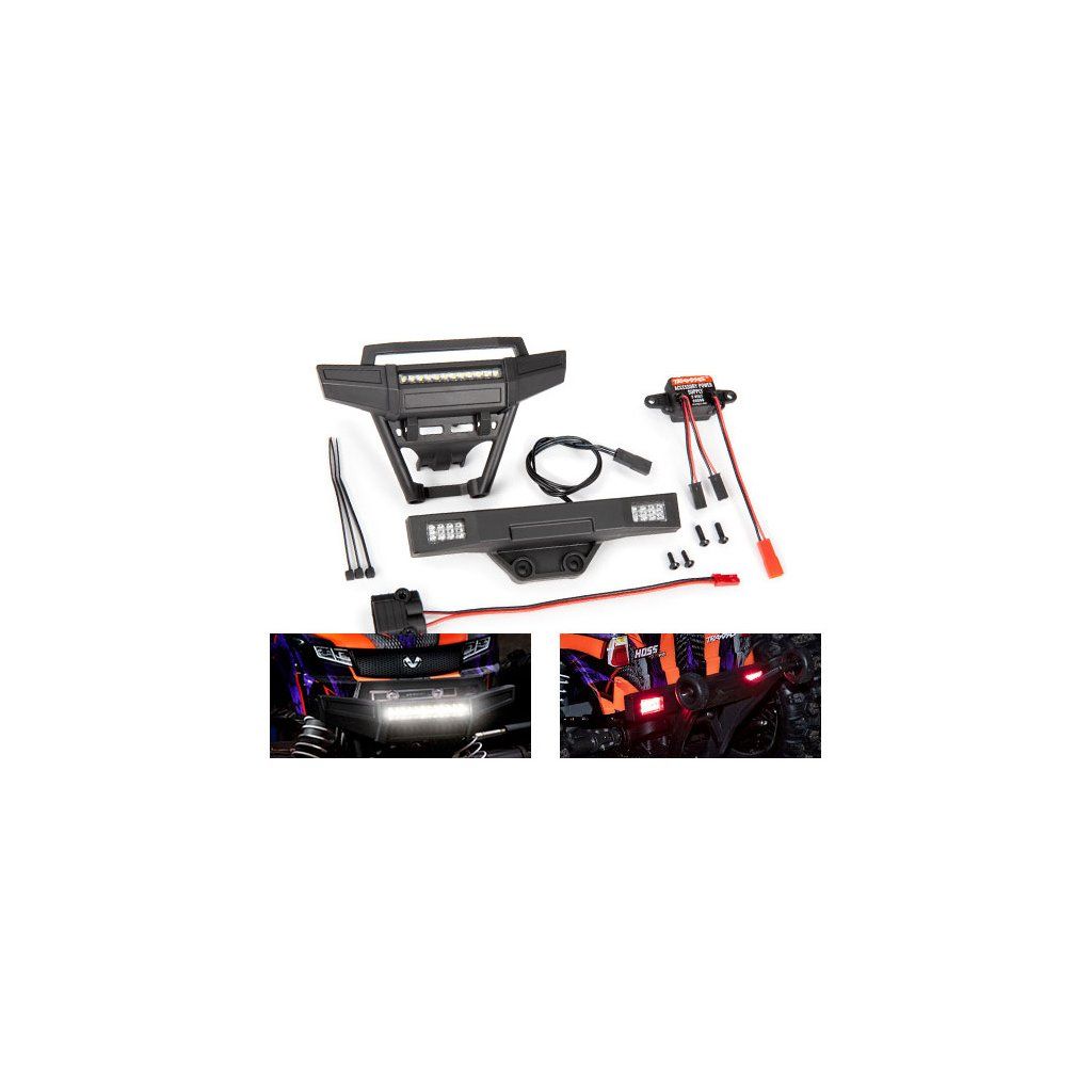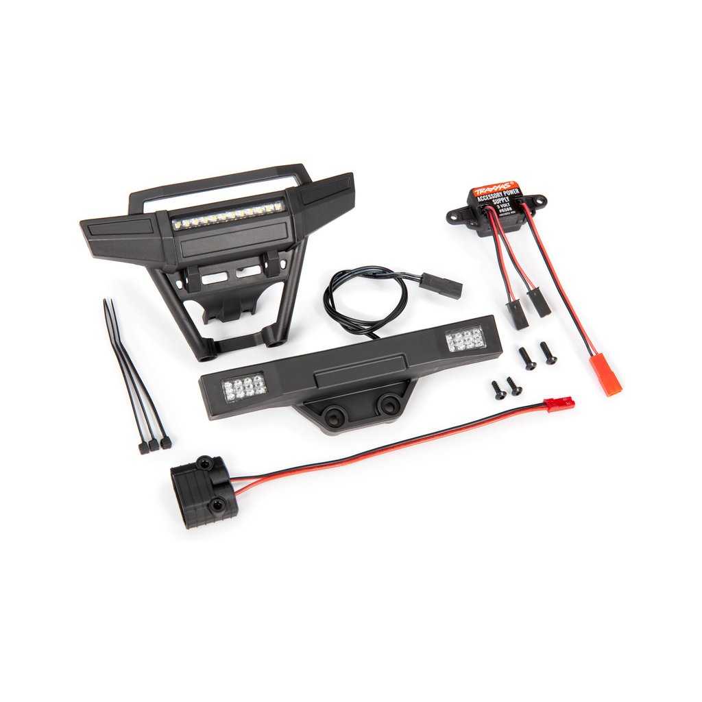 Balení obsahuje: Přední nárazník s LED - TRA9096, zadní nárazník s LED - TRA9097, napájecí zdroj 3V / 3A TRA6588, montážní příslušenství.