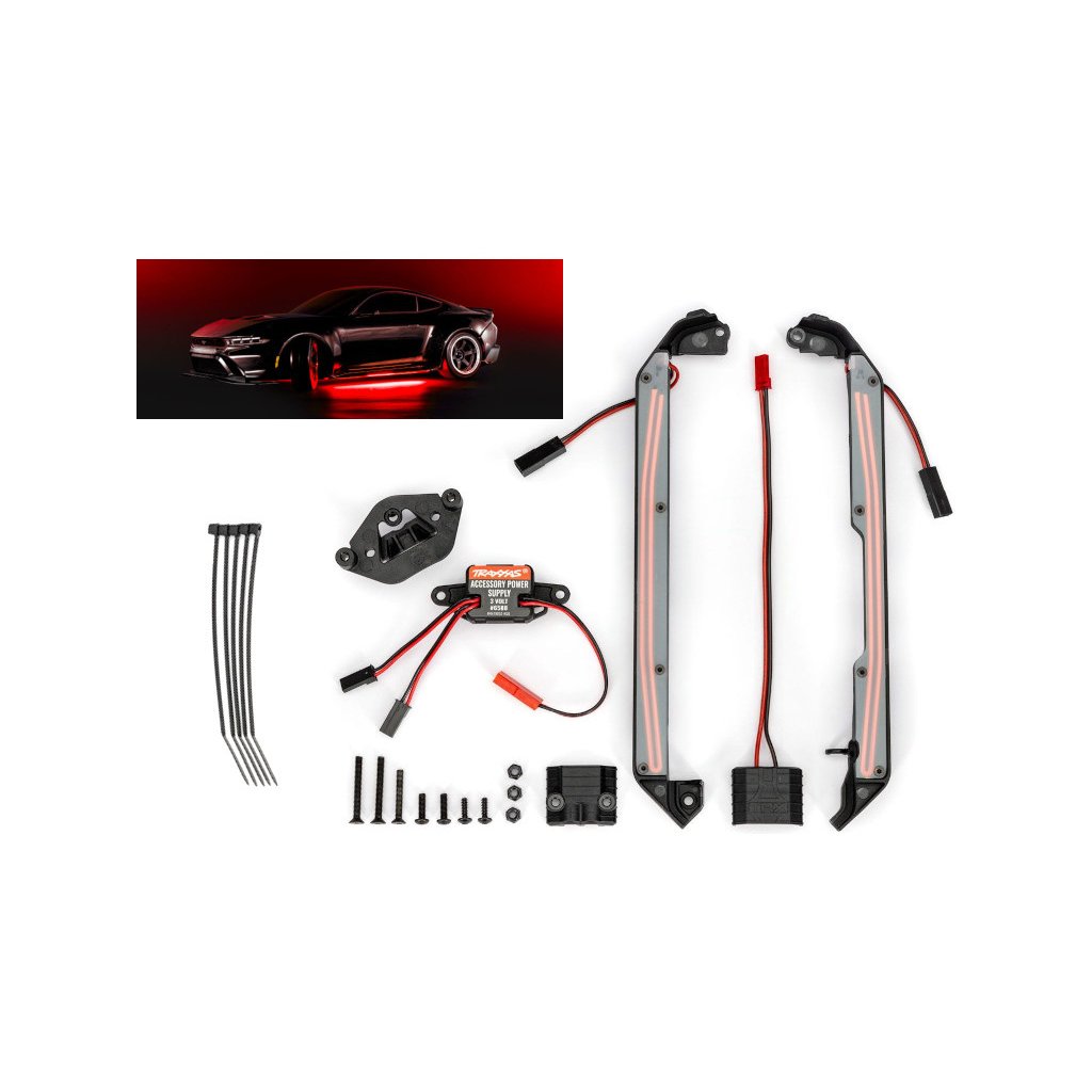 Dodejte svému RC modelu auta s šasi Traxxas 4-Tec ® 2.0 (vč. modelu Drift) extra styl tuningových vozů s touto sadou LED osvětlení podvozku. Sada je také kompatibilní s většinou 200 mm karosérií, které jsou určeny pro tento oblíbený on-road podvozek. Světelné LED pásky jsou bezpečně uzavřeny uvnitř pevného krytu. Celé prahové lišty se jednoduše připevní ke stranám šasi pomocí přiloženého montážního příslušenství. Obsažený 3voltový napájecí zdroj se připojuje přímo ke konektoru regulátoru pomocí adaptéru. Instalace je tak maximálně snadná a není nutné nic pájet.