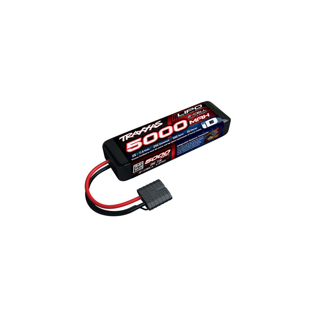 LiPol baterie Traxxas 2 články 7.4 V 5000 mAh pro RC modely aut. Rozměry 25 x 45 x 135 mm, hmotnost 281g. Akumulátor je vybaven novým konektorem Traxxas iD.