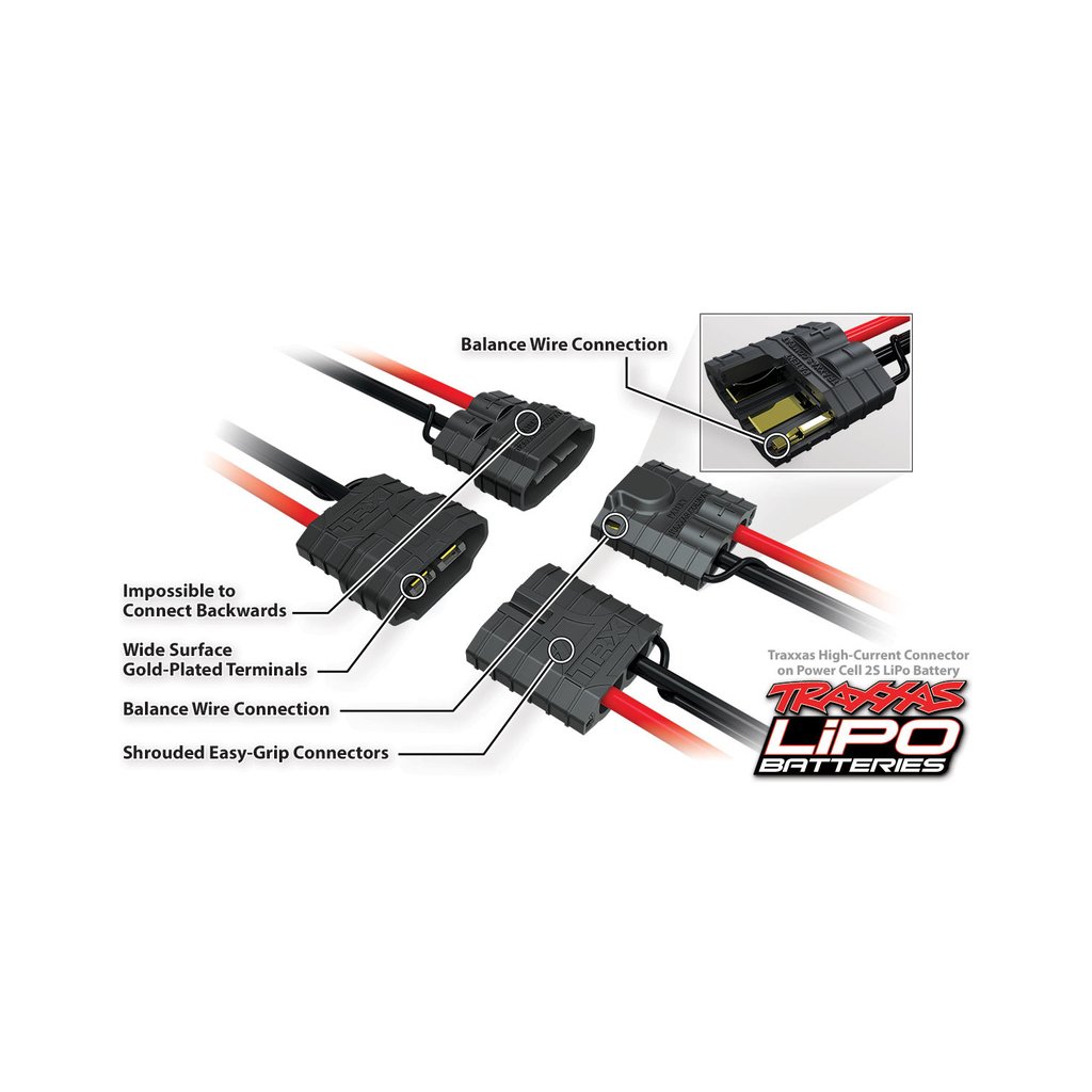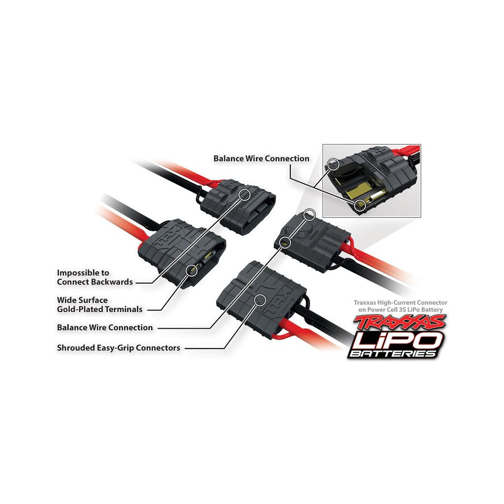 Nové konektory iD Traxxas jsou stejné pro LiPol i NiMH baterie. U LiPol je balanční konektor integrován do silového. Odpadá tedy nutnost připojit zvlášť silový a balanční konektor.