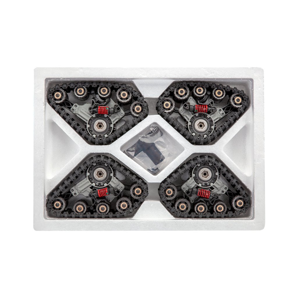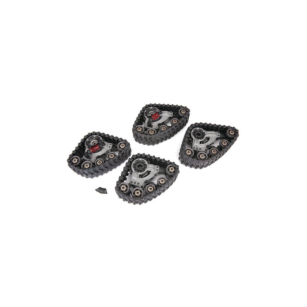 Balení obsahuje 4 kompletně sestavené pásové podvozky na model Traxxas TRX-4, šrouby a klíč středového krytu..