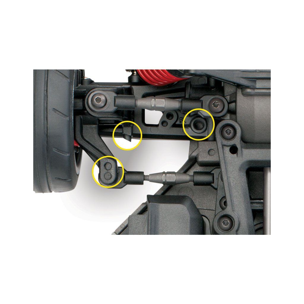 Dále zavěšení obsahuje omezitelný vertikální pohyb ramen. Pomocí stavěcího šroubu M4 můžete omezit vertikální pohyb ramene. To vám umožní rychleji projíždět zatáčky a zlepšuje jízdní vlastnosti při driftování.