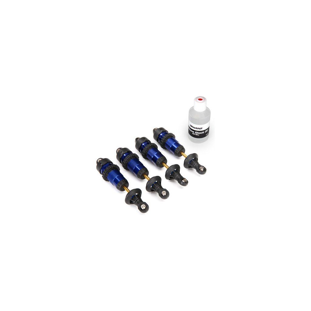 Traxxas tlumič GTR hliníkový modrý (2ks pření, 2ks zadní) se silikonovým olejem. Konstrukce GTR má hliníkové tělo se závitem a kroužkem pro přesné nastavení předpětí. Chromované hřídele mají vysokou životnost a hladký chod. Uvnitř tlumiče jsou tlumící pryžové tělesa kompenzující objem, aby se zajistilo dokonalé tlumení v celém rozsahu. Tlumiče GTR jsou doporučeny pro nitro auta Traxxas, pro XO-1, E-Revo® VXL.
