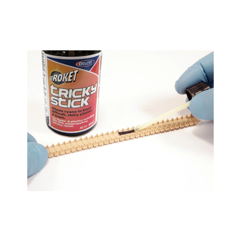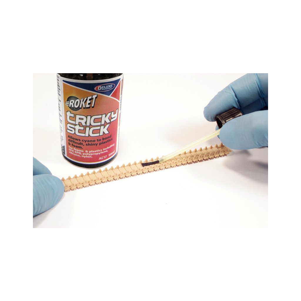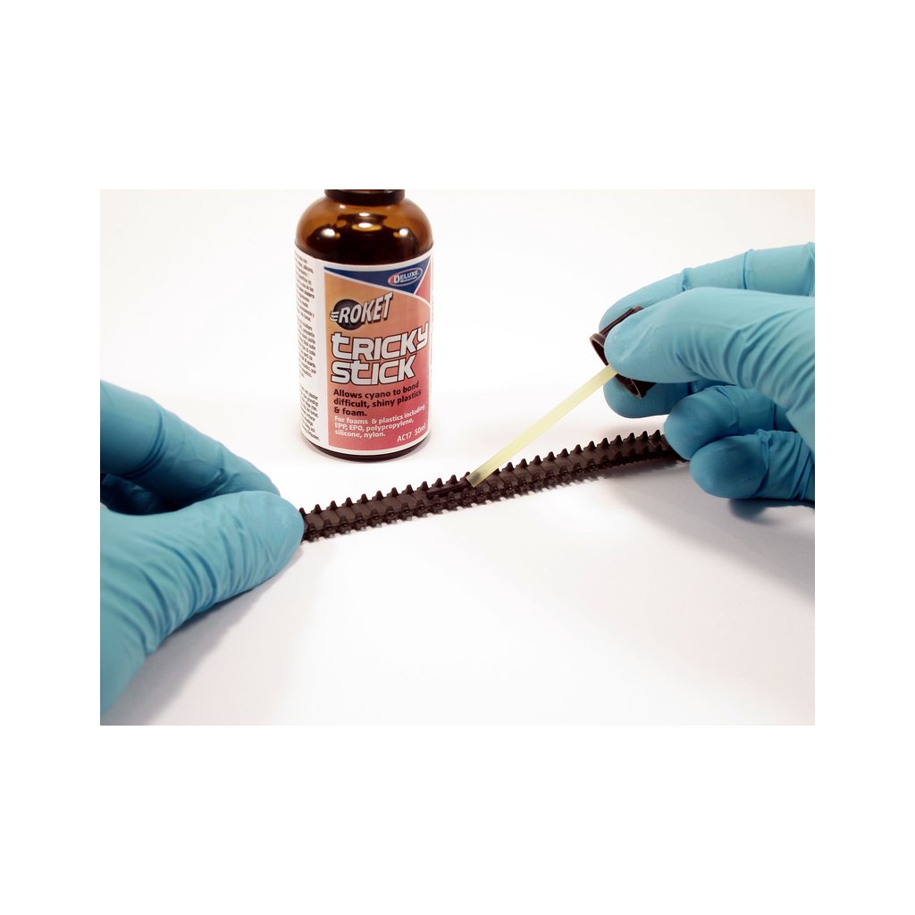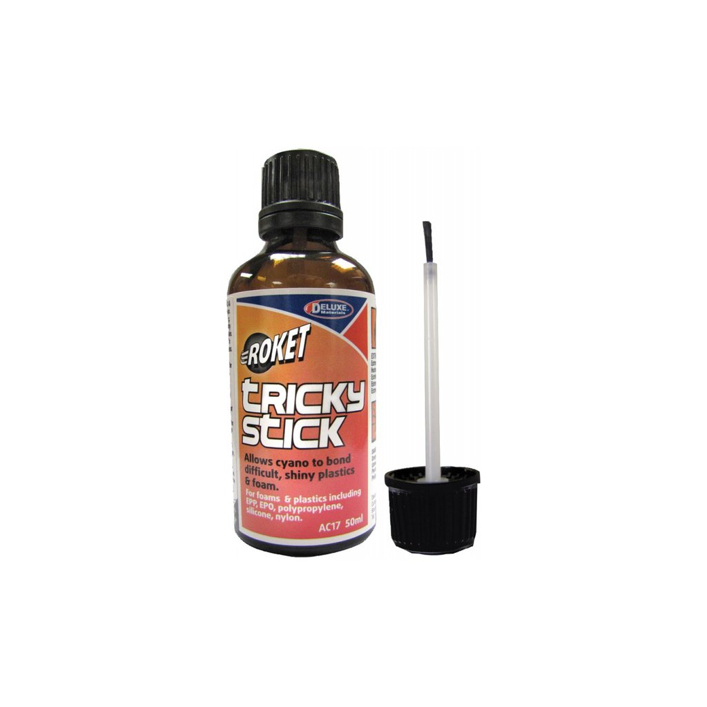 Tricky Stick je přípravek pro lepení těžko lepitelných plastů vteřinovými lepidly. Aktivuje povrch plastů pro lepší přilnutí lepidla. Nanáší se štětečkem na místa, která mají být lepeny.