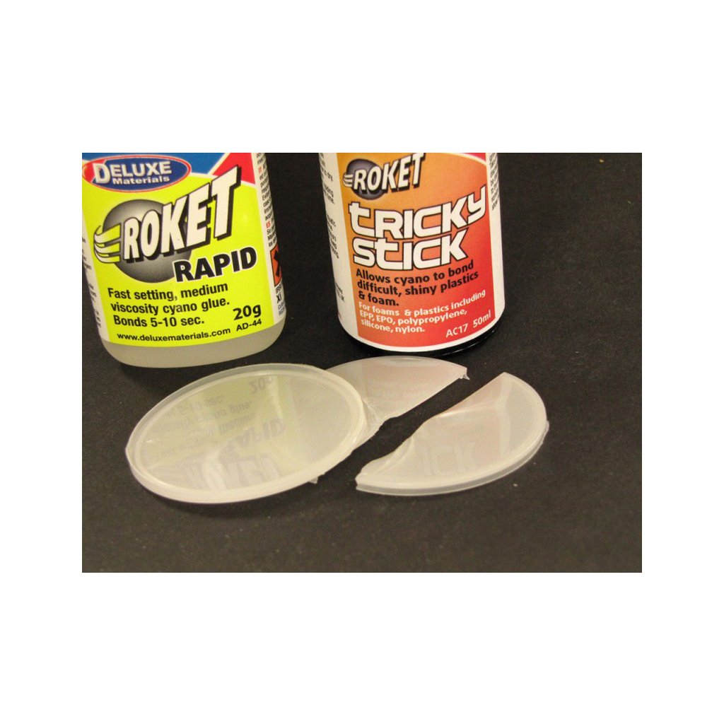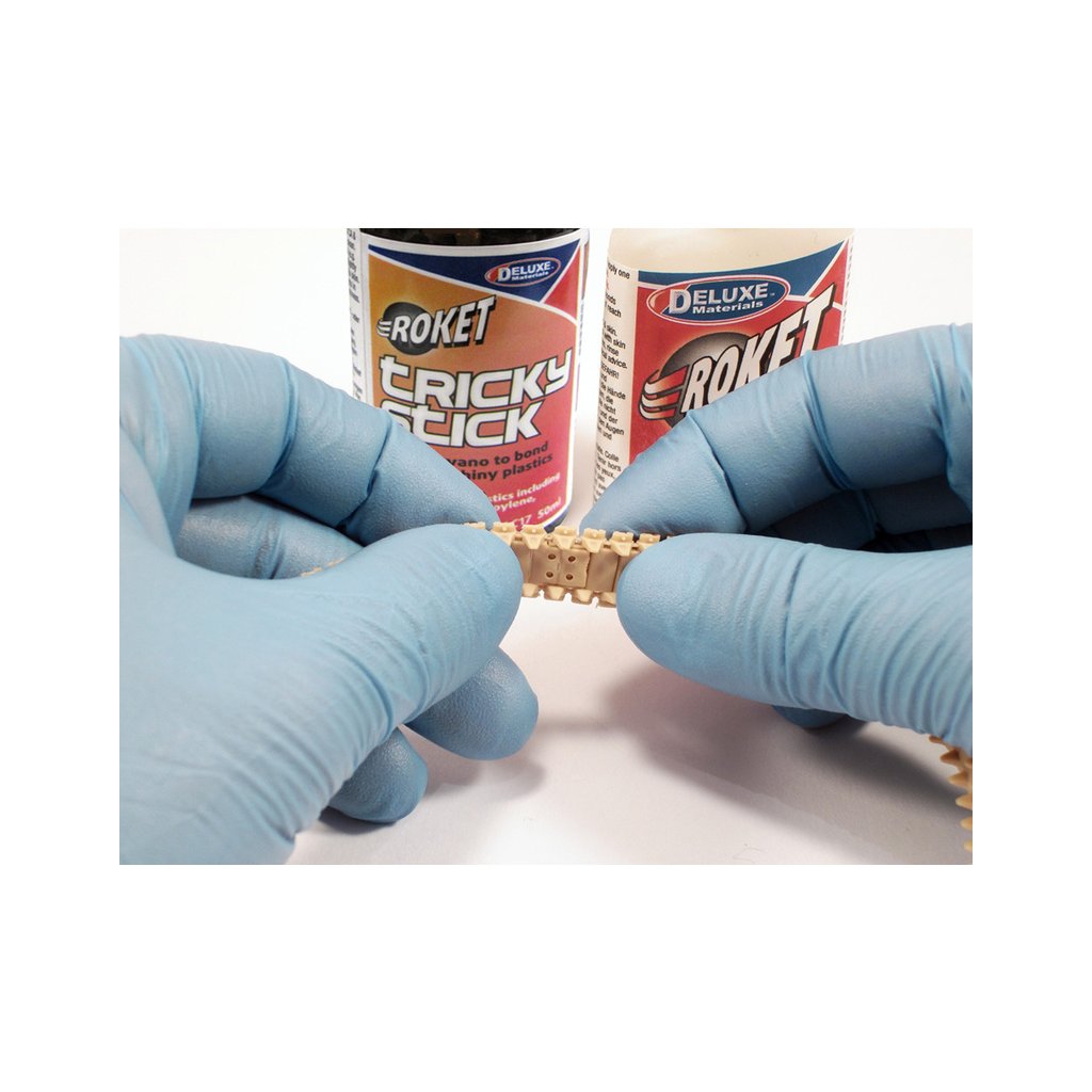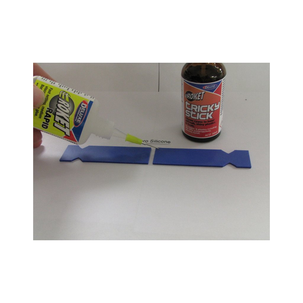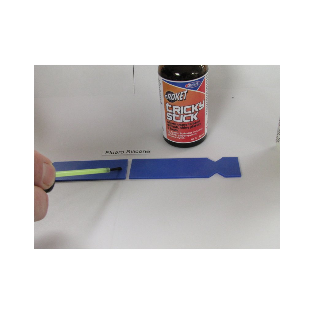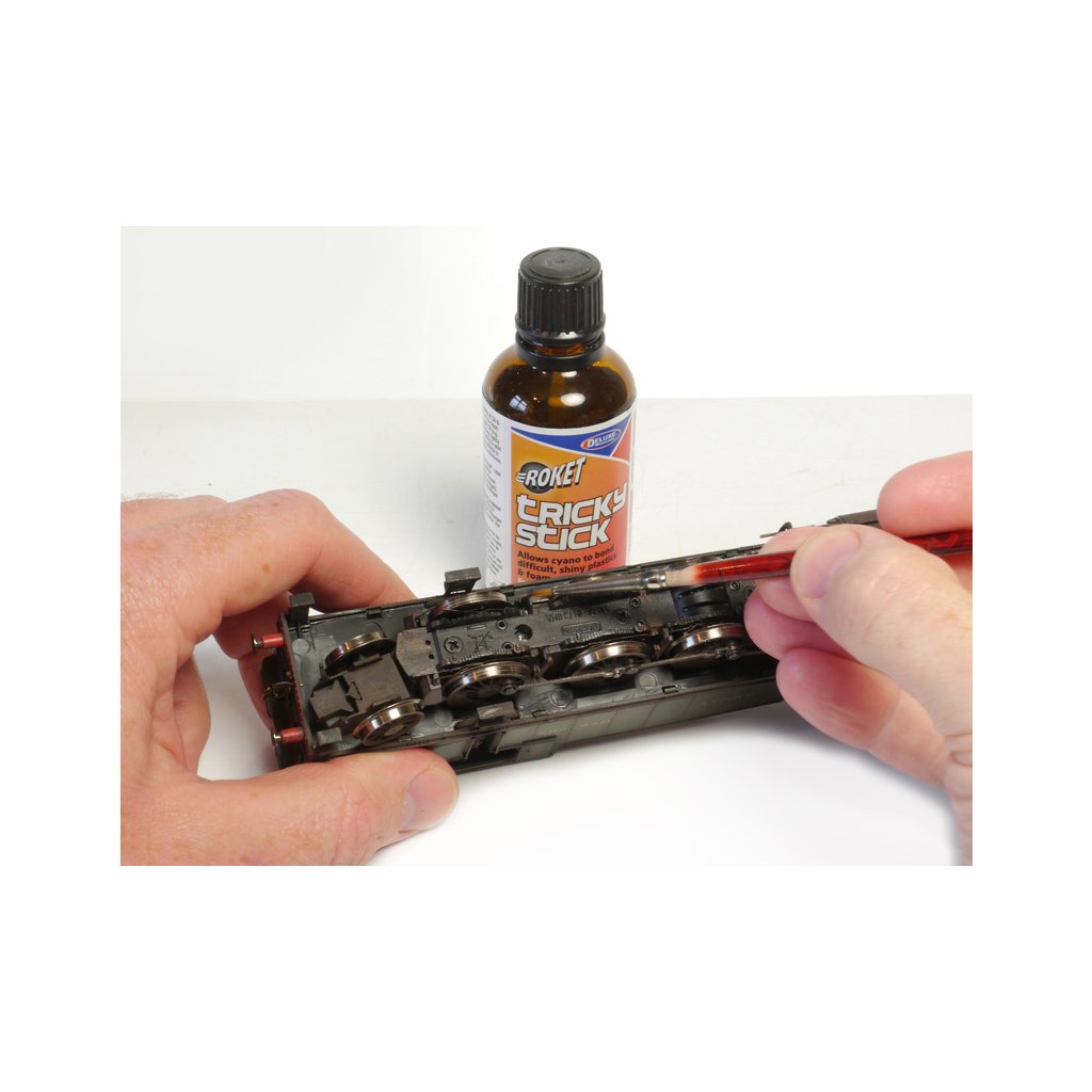 Tricky Stick je přípravek pro lepení těžko lepitelných plastů vteřinovými lepidly. Aktivuje povrch plastů pro lepší přilnutí lepidla. Nanáší se štětečkem na místa, která mají být lepeny.