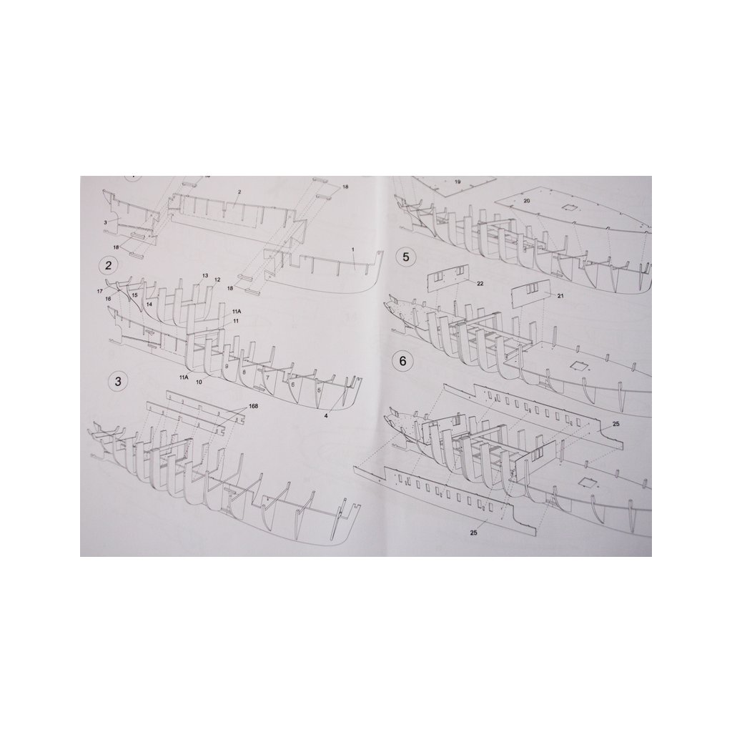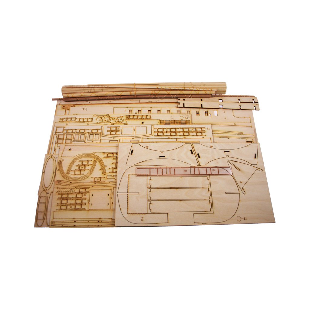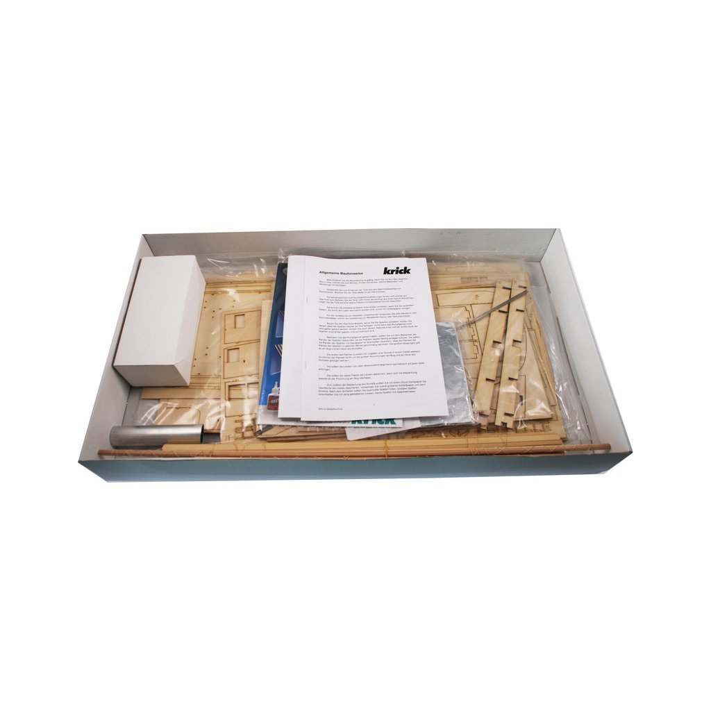Sada obsahuje všechny dřevěné díly vyříznuté laserem a díly příslušenství a doplňků, vyrobených z litého kovu. Stavební příručka se skládá z četných ilustrací, které provázejí stavbou.