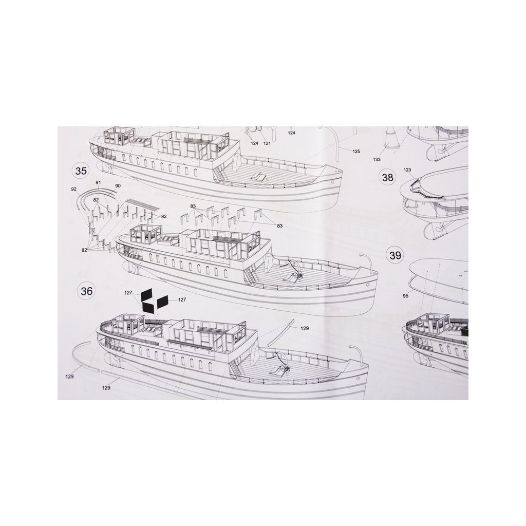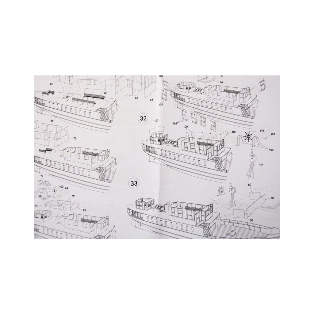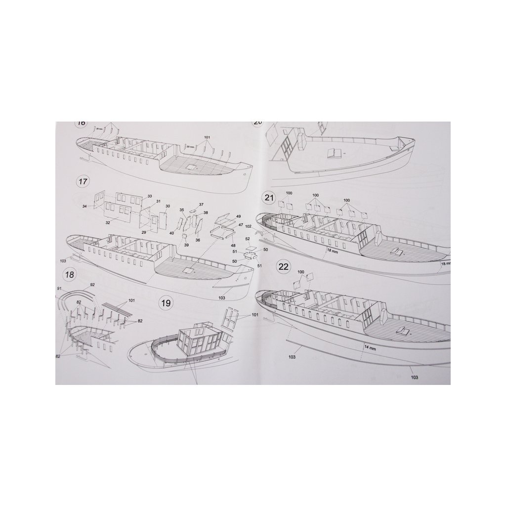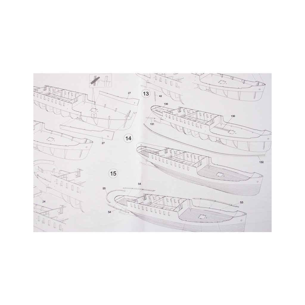 Sada obsahuje všechny dřevěné díly vyříznuté laserem a díly příslušenství a doplňků, vyrobených z litého kovu. Stavební příručka se skládá z četných ilustrací, které provázejí stavbou.