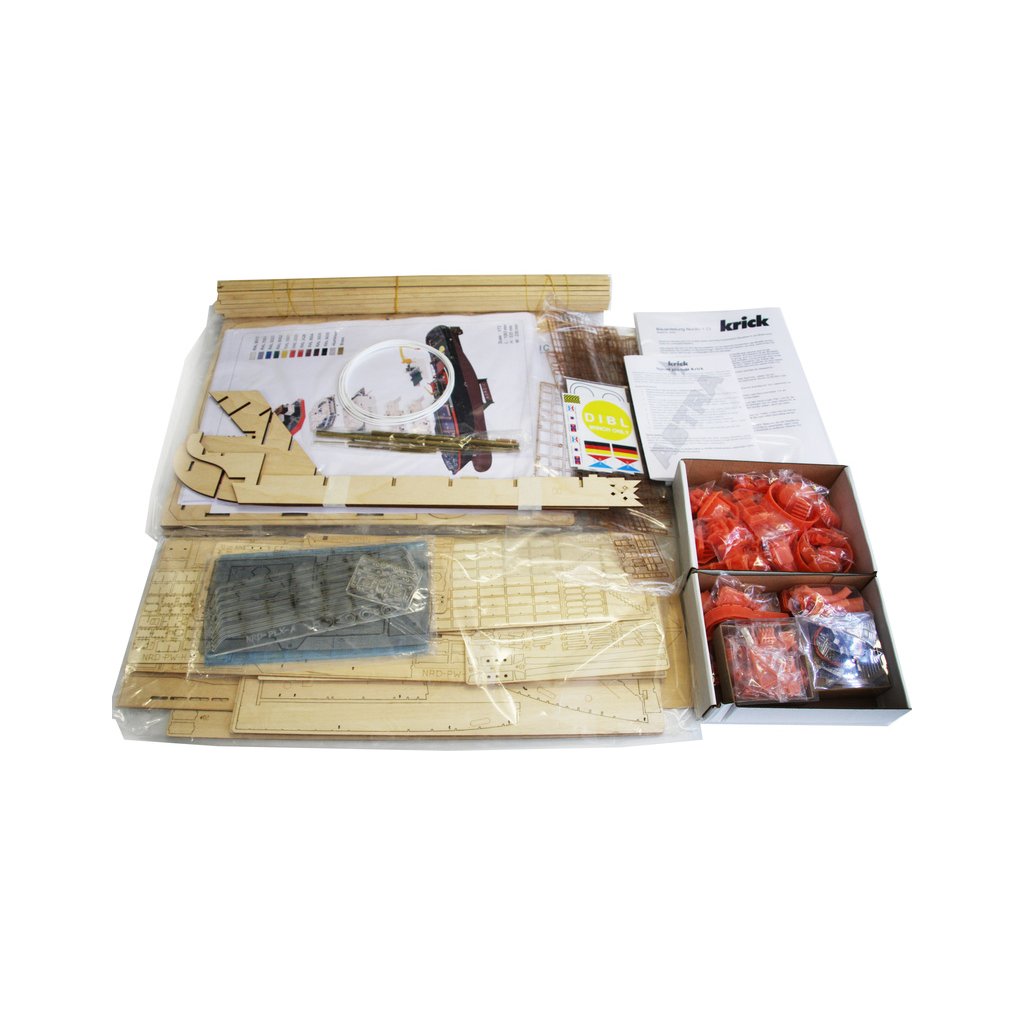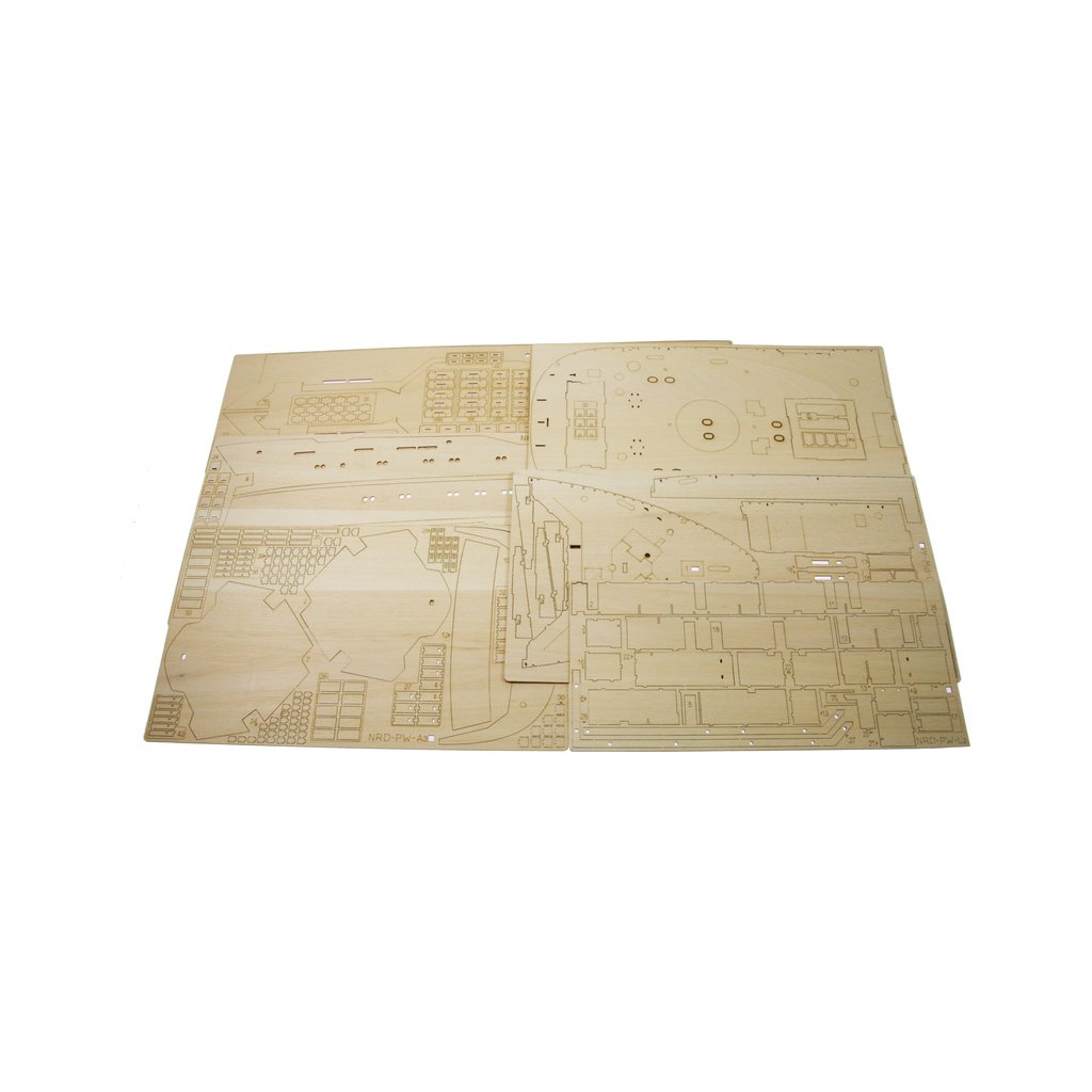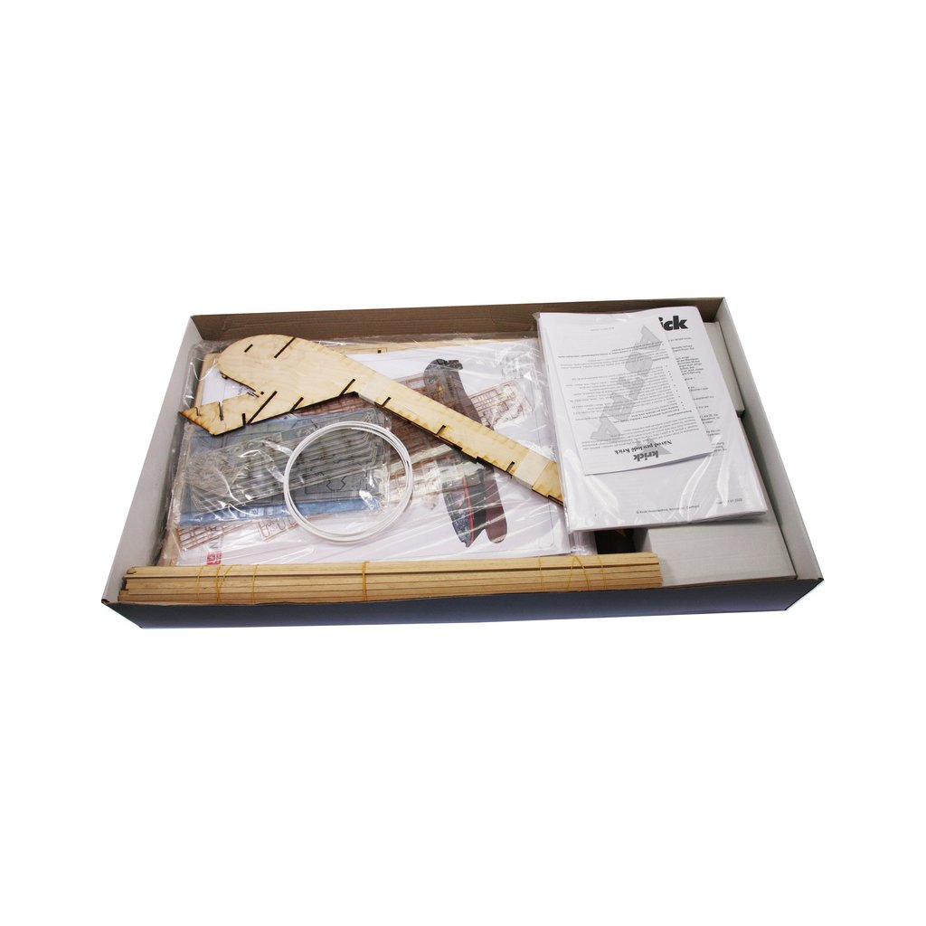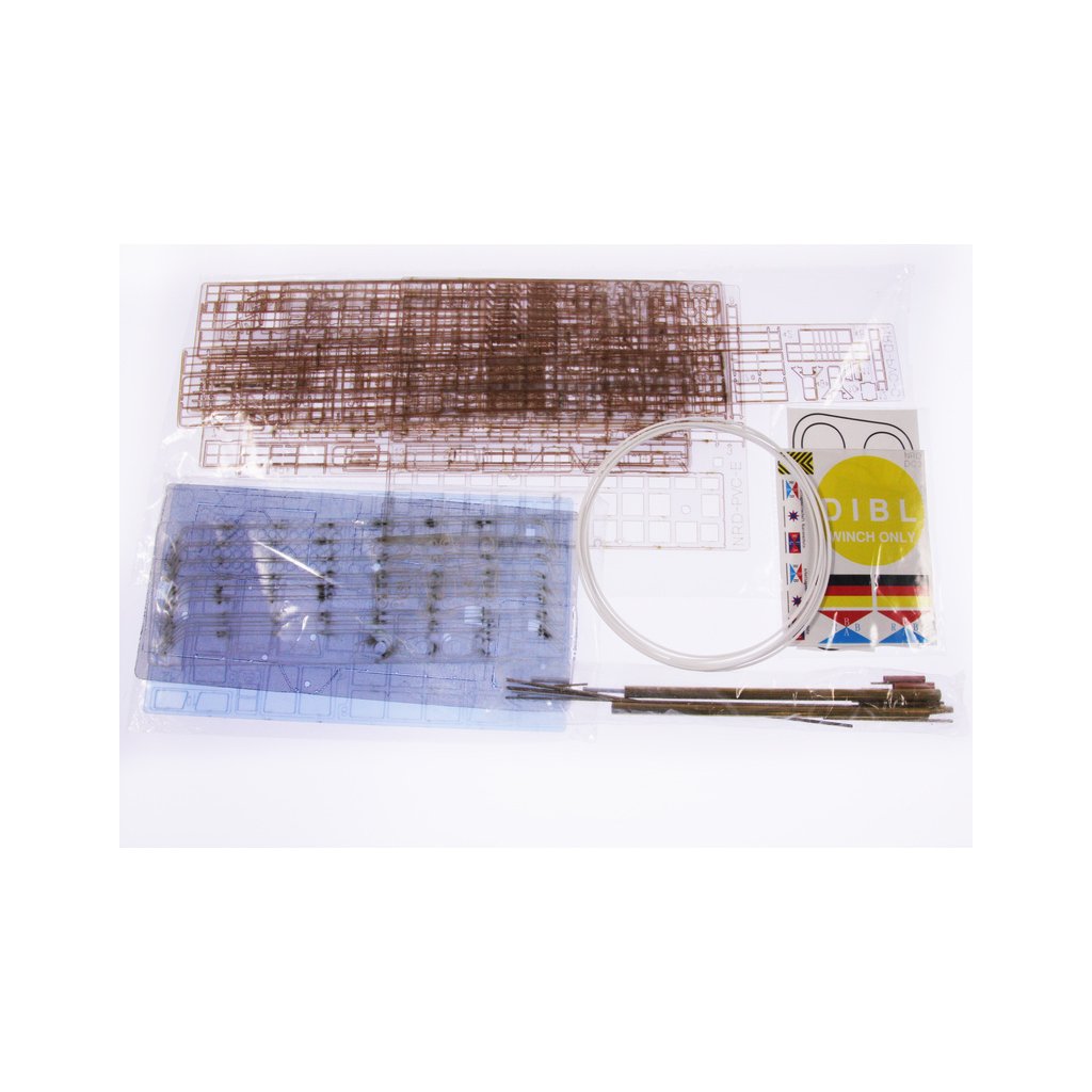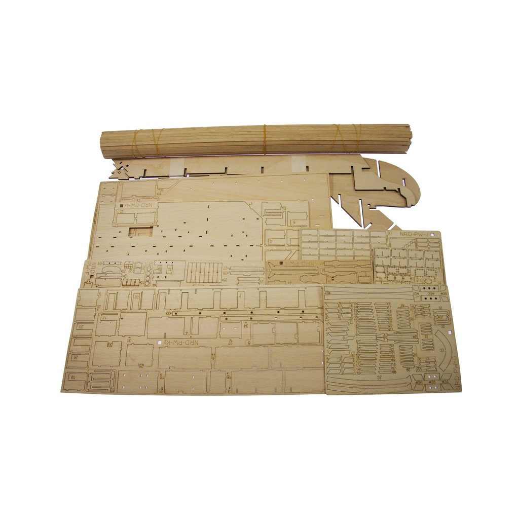 Balení obsahuje díly pro stavbu lodi: díly překližky, lišty z Abachi, laserem řezané dřevěné díly, maketové díly 3D tisku. Obrázkový manuál EN.