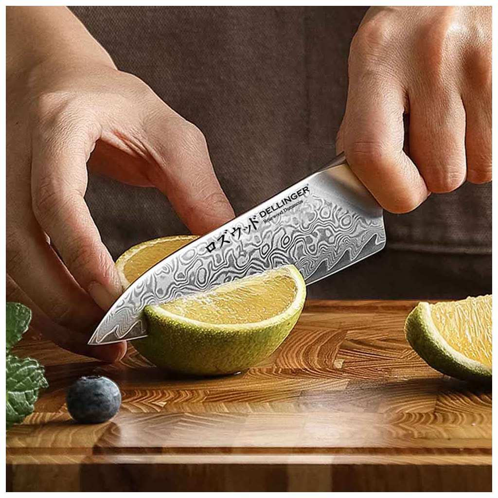 Nová série nožů Dellinger Rose Wood Damascus přináší spojení tradičního japonského designu a moderních materiálů. Tento univerzální nůž, známý jako "Petty Utility Knife" (ペティナイフ, peti-naifu), je ideální volbou pro precizní kuchyňské úkoly. Díky délce čepele 135 mm je perfektní pro krájení menších surovin, filetování, loupání nebo zdobení, a skvěle doplňuje větší nože, jako jsou gyuto nebo santoku.