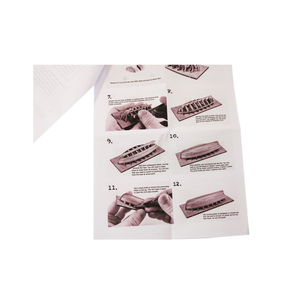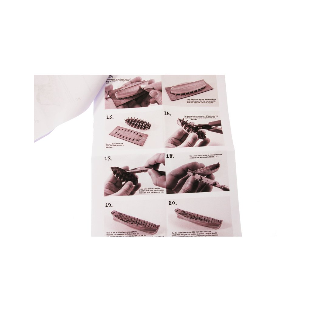 Balení obsahuje sadu překližkových dílů, díly z mosazi, stavební desku s výřezy pro stavbu kýlu a kostry a manuál EN.