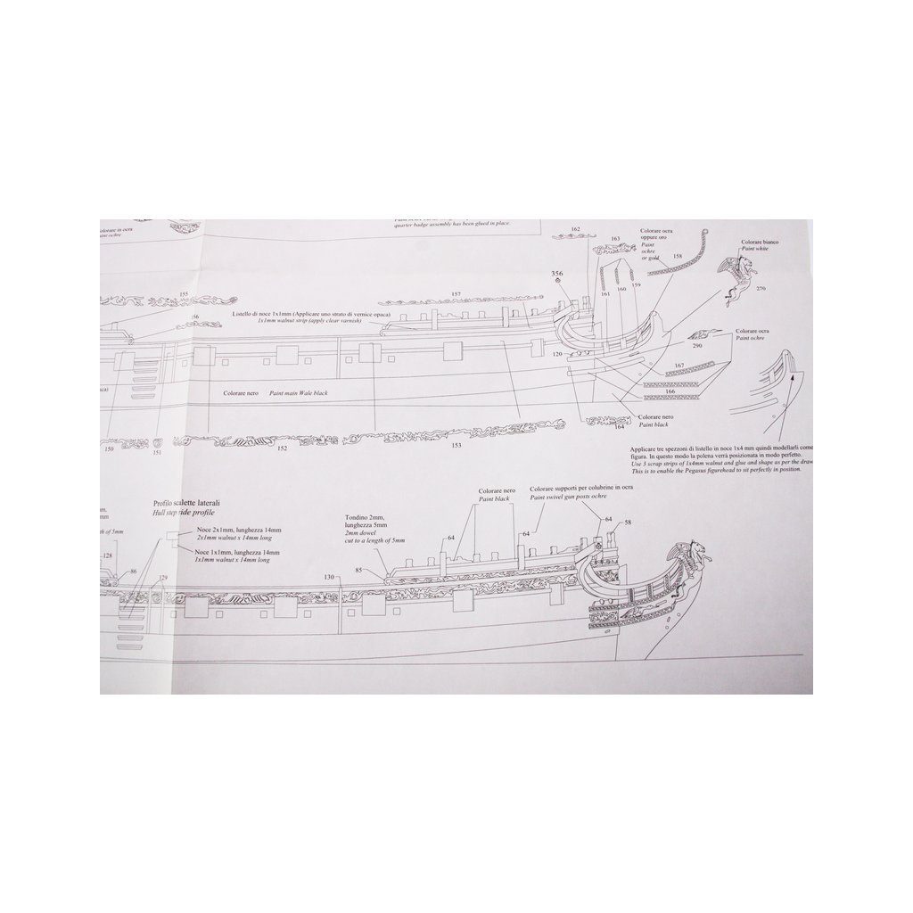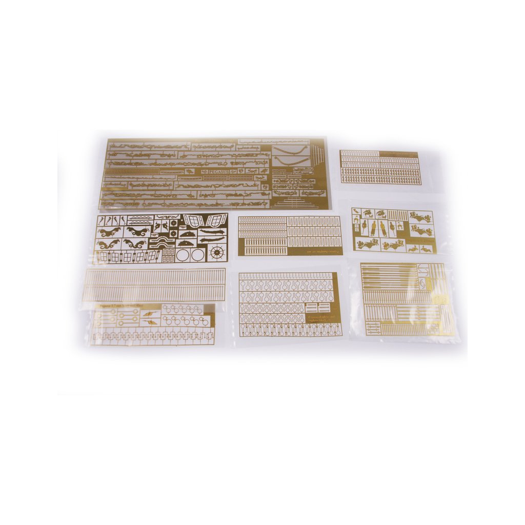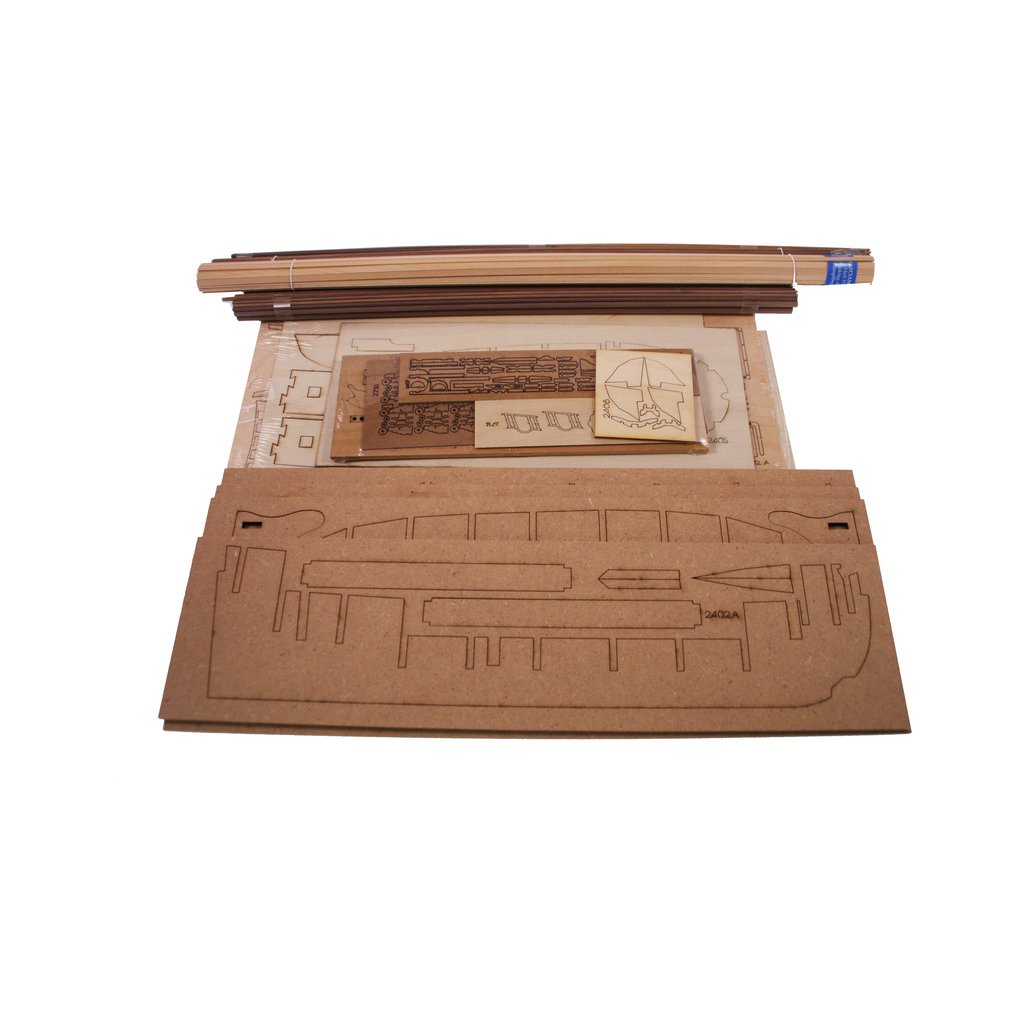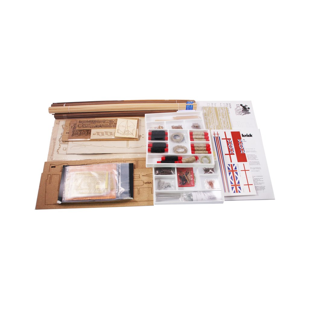 Souprava obsahuje leptané mosazné díly (až na vesla a člunové kování, stejně jako mnoho dekorací), laserem řezané dřevenné díly, čluny, leptané měděné desky pro podmořské plavidlo, pozoruhodný soubor vlajek a velmi podrobné výkresy a plány. Žebra a kýl jsou řezány laserem z 5mm překližky, další části jsou vyrobeny z pevného ořechu, překližky.