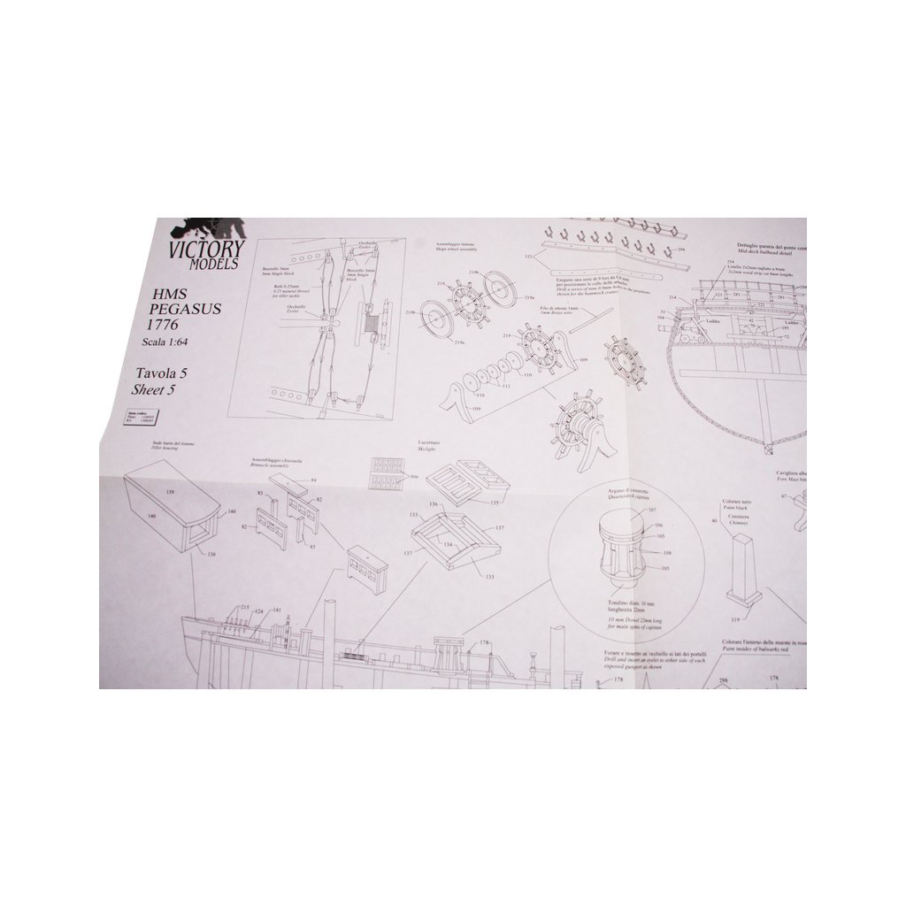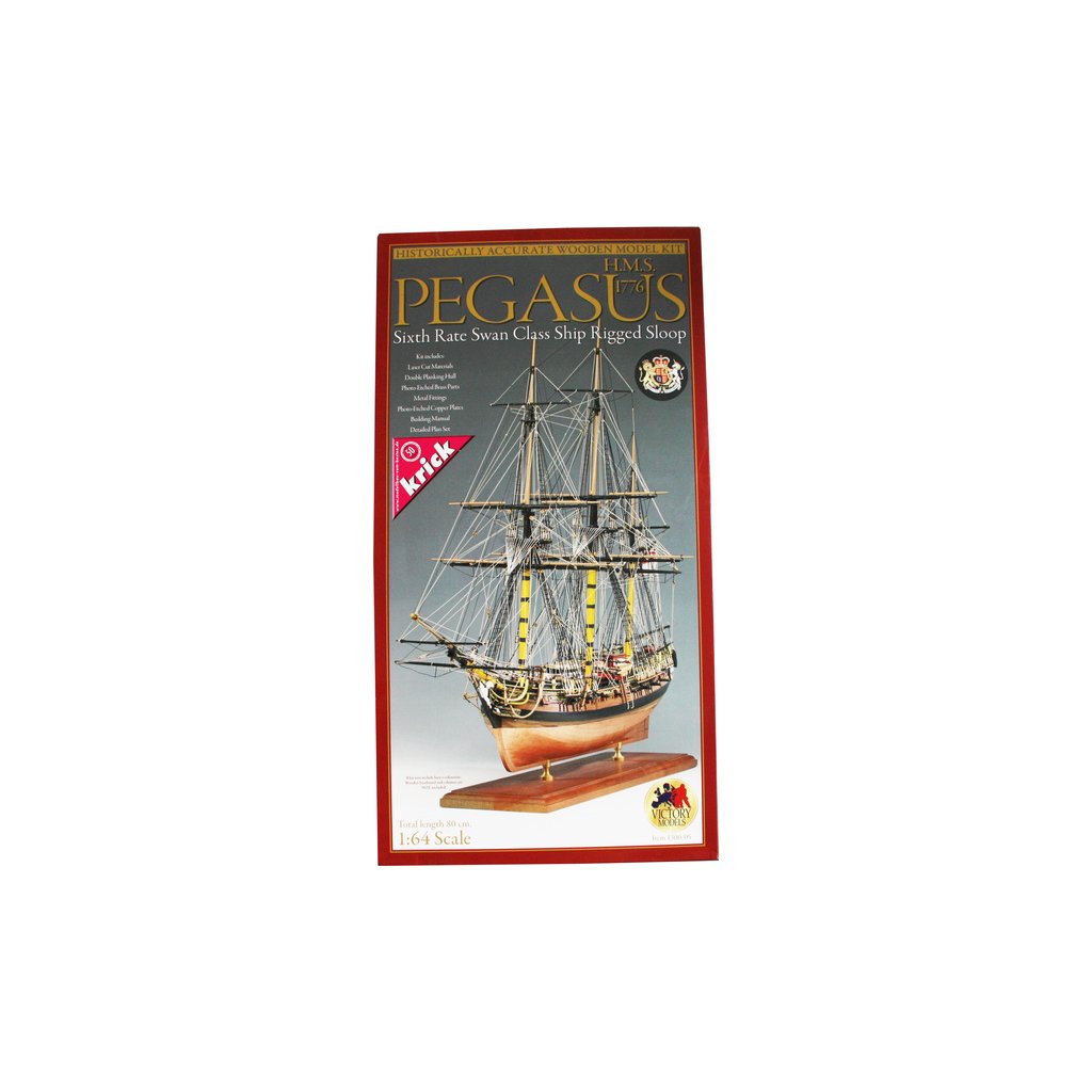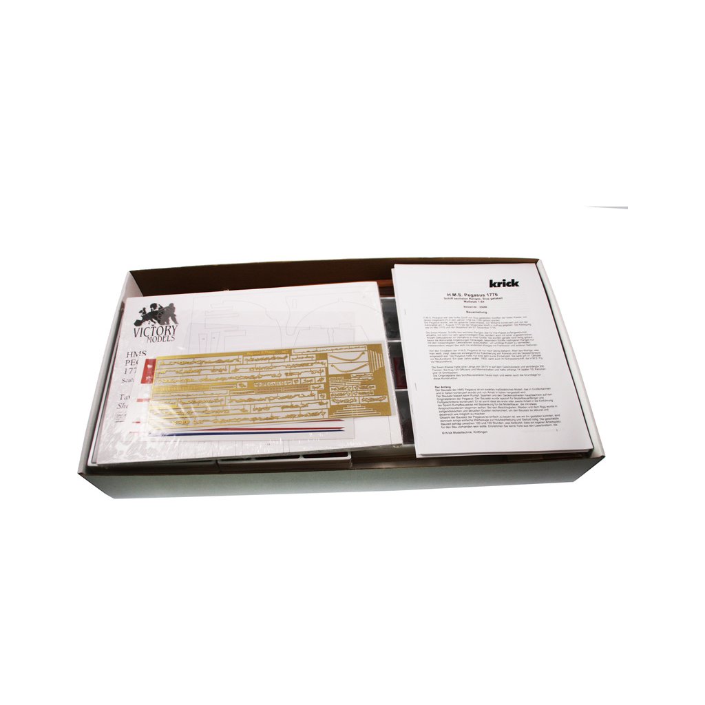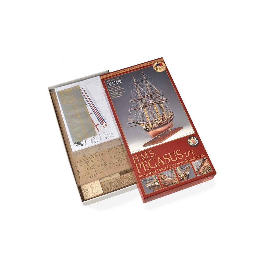 Obsahem balení je stavebnice lodi VICTORY MODELS H.M.S Pegasus 1776 1:64 kit. Balení obsahuje sadu překližkových dílů, sadu dřevěných lišt o různém průřezu, blistr s drobnými díly, díly z mosazi, sadu výkresů a vícejazyčný manuál.