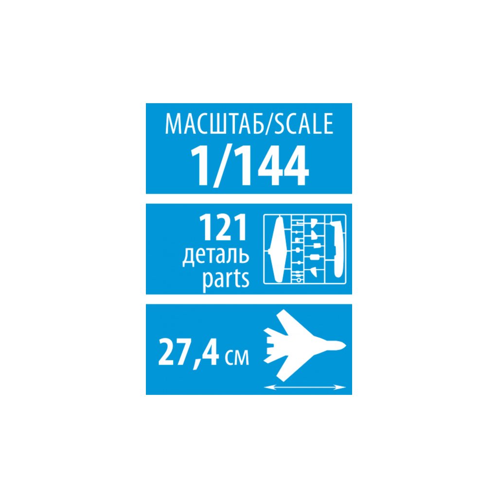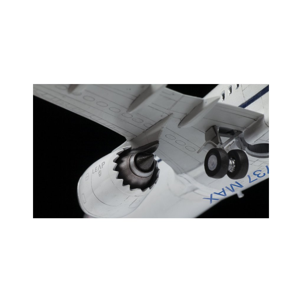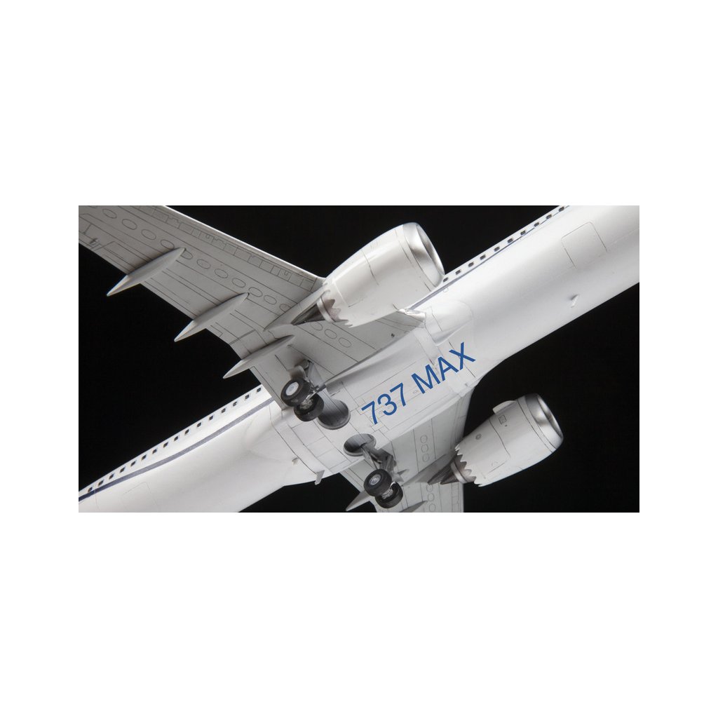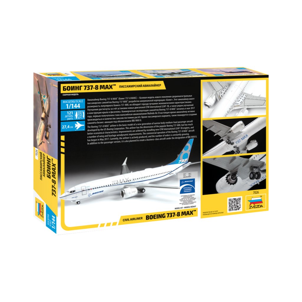 Plastikový model Zvezda 7026 - letadlo Boeing 737-8 MAX v měřítku 1:144 ke slepení. Stavebnice obsahuje 121 dílků, délka 274 mm, obtížnost 4.