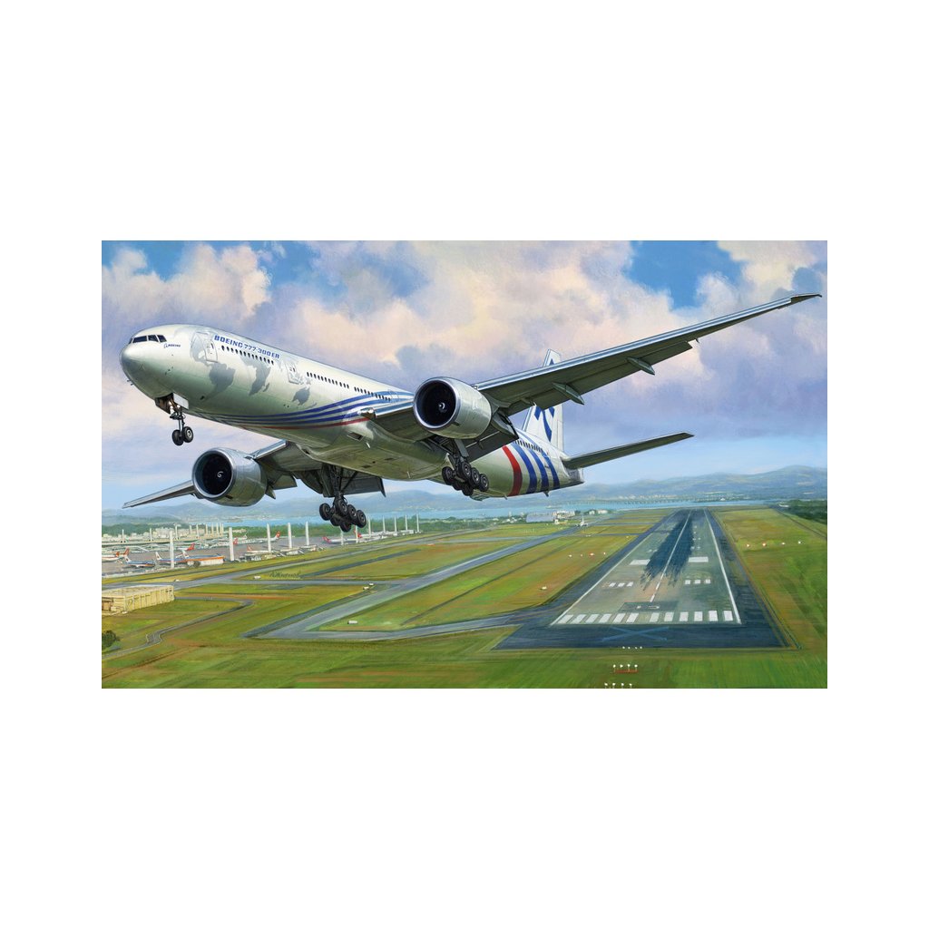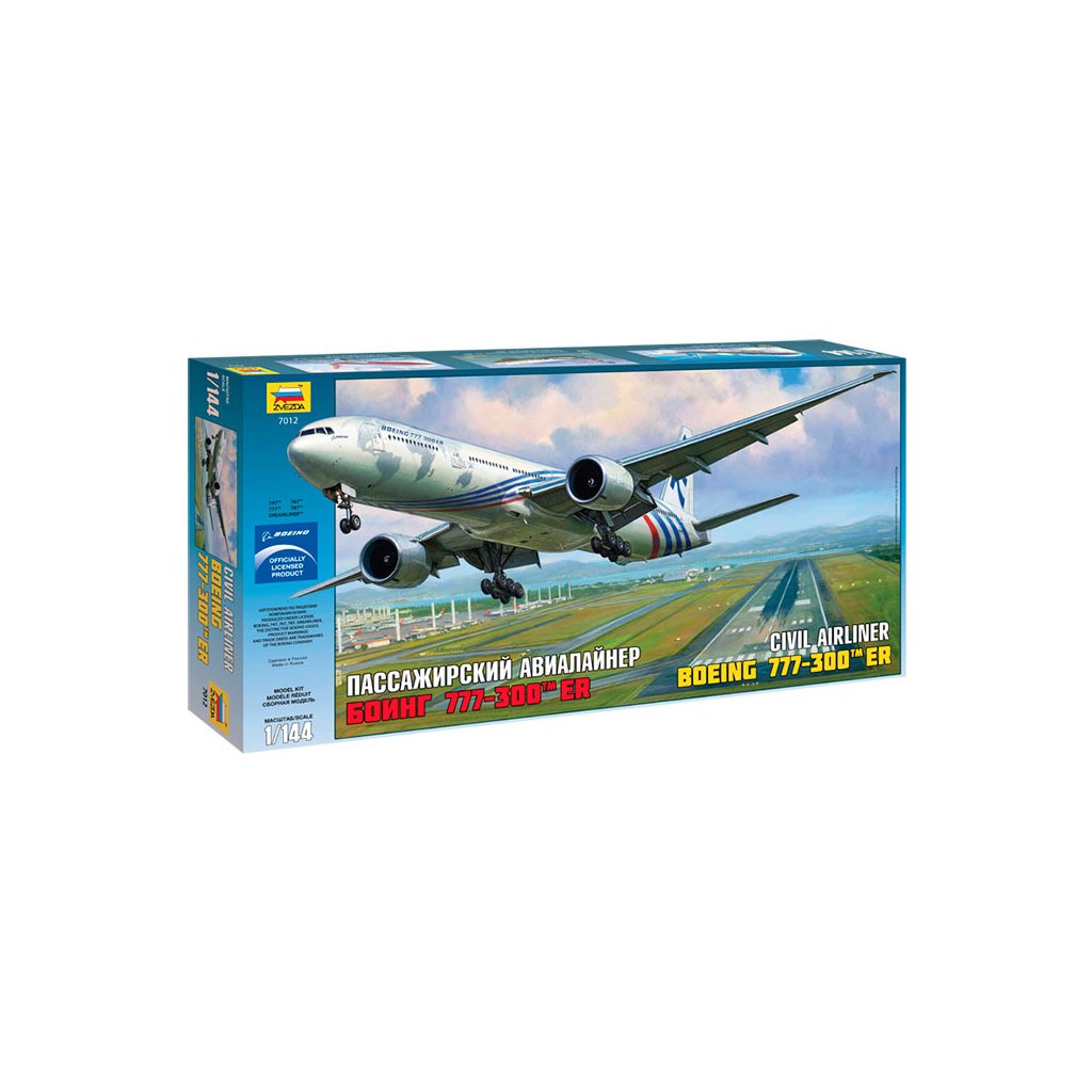 Plastikový model Zvezda 7012 - osobní dopravní letadlo Boeing 777-300 ER v měřítku 1:144 ke slepení. Stavebnice obsahuje 147 dílků, délka 513 mm, obtížnost 3.