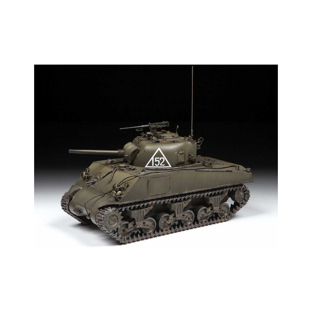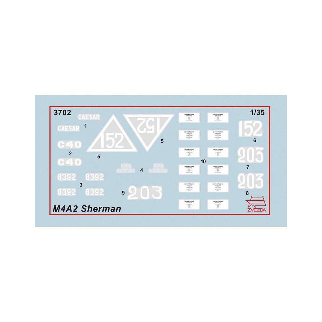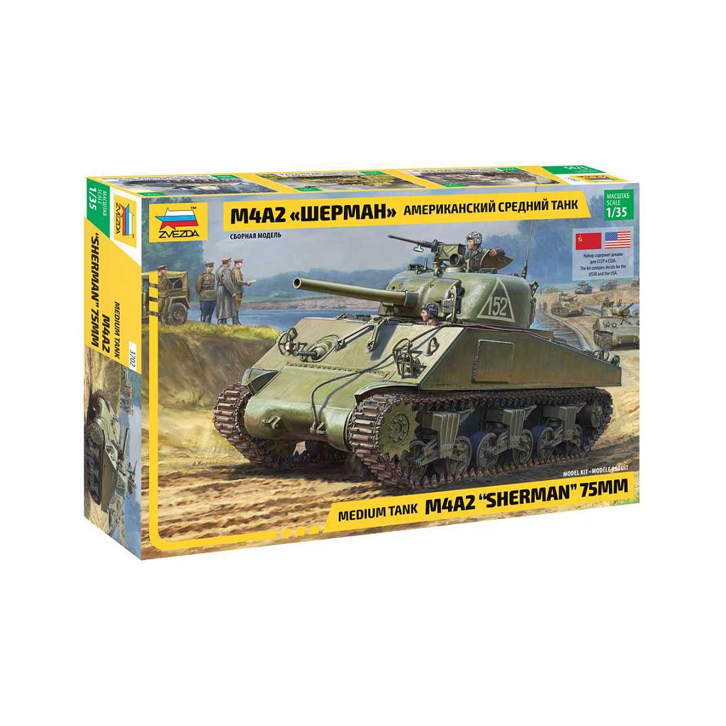 Plastikový model Zvezda 3702 - americký střední tank Sherman M4A2 v měřítku 1:35 ke slepení. Stavebnice obsahuje 277 dílků, délka 170 mm.