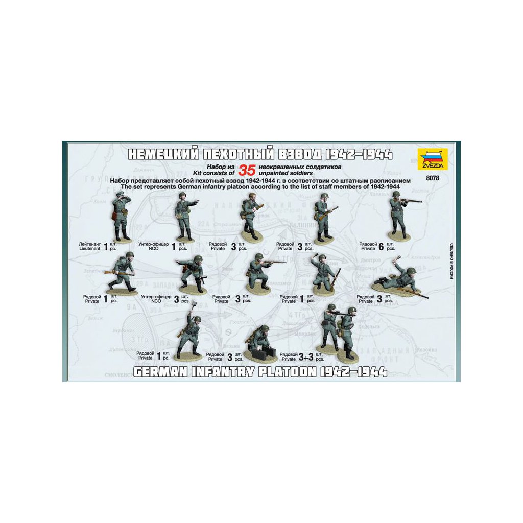 Sada figurek Zvezda 8078 německé pěchoty druhé světové války doplňujících modely. Velikost figurek je 1:72; 2,4 cm. Ideální pro doplnění plastikových modelů či diorámat.