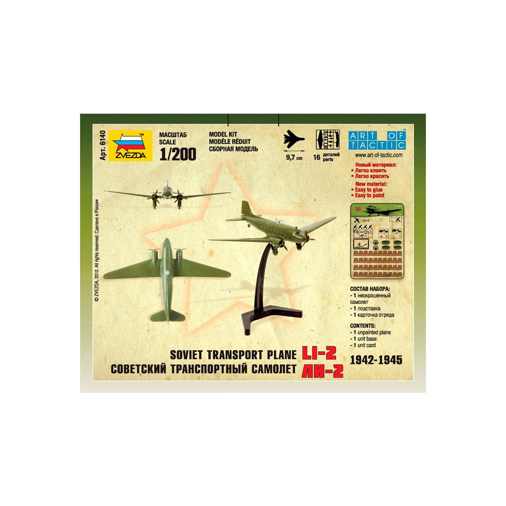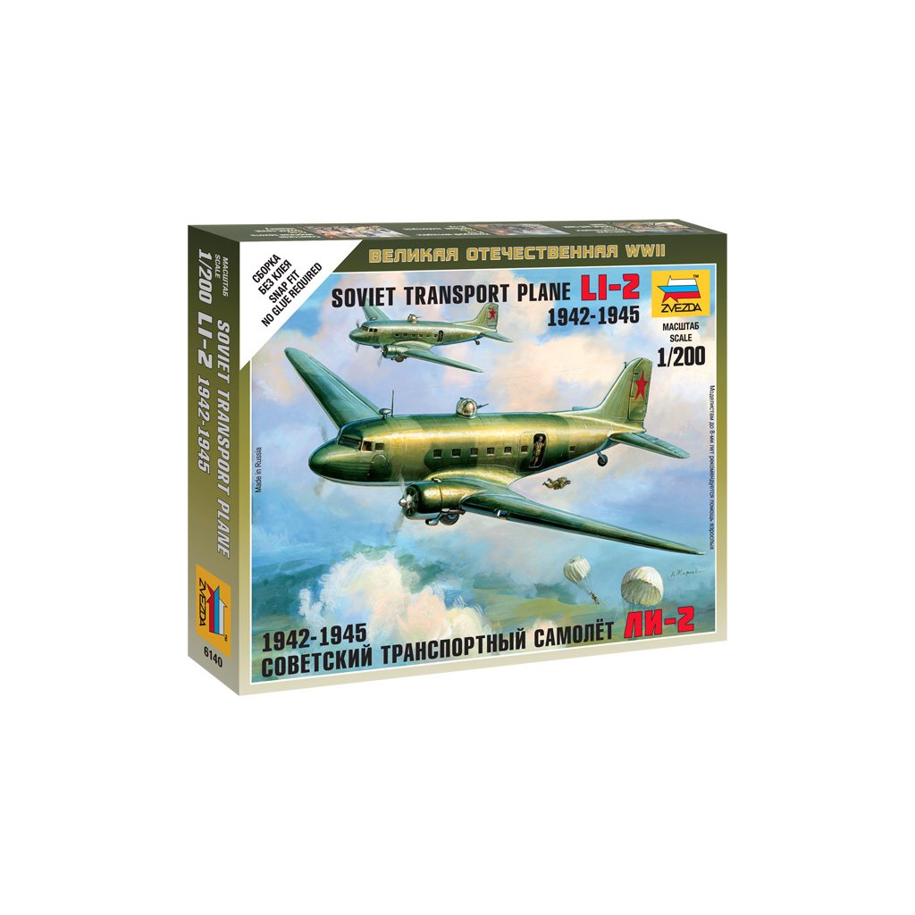Plastikový model Zvezda 6140 – letadlo Lisunov Li-2 v měřítku 1:200. Stavebnice obsahuje 16 dílků, délka 97 mm, obtížnost 1.